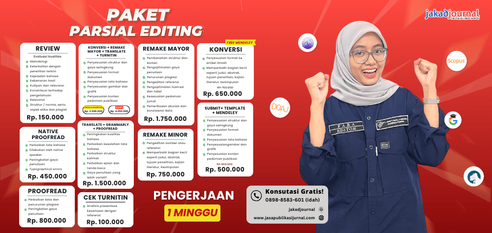 Kami jasa publikasi jurnal nasional Sinta 1 – 6, internasional ( Doaj, Copernicus, Wos, Scopus ) penerbitan buku, editing service, dan pengurusan HAKI.